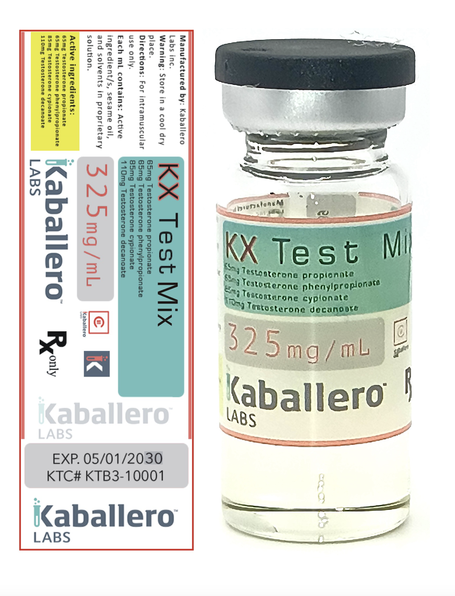 KX Test Mix 325mg comes in a 10mL multi dose vial;  it contains 4 testosterone esters in the product: 65mg of Testosterone Propionate, 65mg of Testosterone Phenylpropionate, 85mg of Testosterone Cypionate, and 110mg of Testosterone Deconate (325mg total).